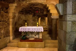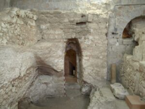 The excavation of another 1st-century structure in Nazareth, near the Church of the Annunciation, provides additional insight into the ancient village, with analysis showing that a family observing the Law of Moses lived there during the 1st century and the time of Jesus. Interestingly, this house had another church built around it during the Byzantine period, and it was revered as the childhood home of Jesus. The Church of the Nutrition, as it is called, and its accompanying 1st-century house designated “Structure 1,” are located in Nazareth beneath the convent of the Sisters of Nazareth, which is up the street from the Church of the Annunciation. When constructed, the church was cut into the rocky hillside, and the rest of the structure was built with stone and mortar. It is a courtyard-style house, and one of the doorways stands intact. The ground floor was chalk, and a staircase led to an upper floor. Stone, being prevalent in this area, was the most obvious and economical material for construction.